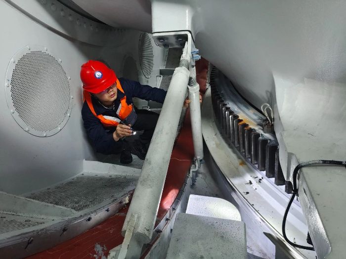 ▲突擊隊(duì)成員在風(fēng)機(jī)機(jī)艙開展偏航系統(tǒng)檢查 攝影:郭逸博
