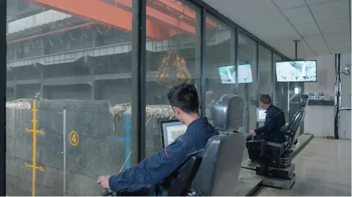 工作人員正在操作垃圾吊