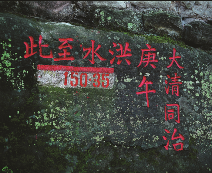 此題刻為云陽縣令所刻,后經(jīng)長江委歷史洪水調(diào)查時(shí)測定并補(bǔ)刻洪水高程“150.35”)